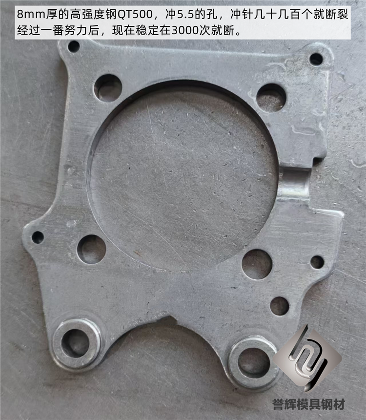 他發(fā)產(chǎn)品給我看過,也看過他們的工作群,沖頭是排排斷,批量批量斷,他們認為這種沖頭是根本沒辦法解決的,現(xiàn)在能夠穩(wěn)定在3000沖次斷沖頭,他們已經(jīng)很開心了,因為3000次換個沖針,他的生產(chǎn)是可以繼續(xù)的,是可以進行的,但是只是幾十個,幾百個就崩沖頭,那是比較惱火的,整個公司從上到下都認為這種工況的沖頭就是要崩裂的,是沒辦法解決的。路上聊天時,我是給他推薦8566防崩模具鋼的。