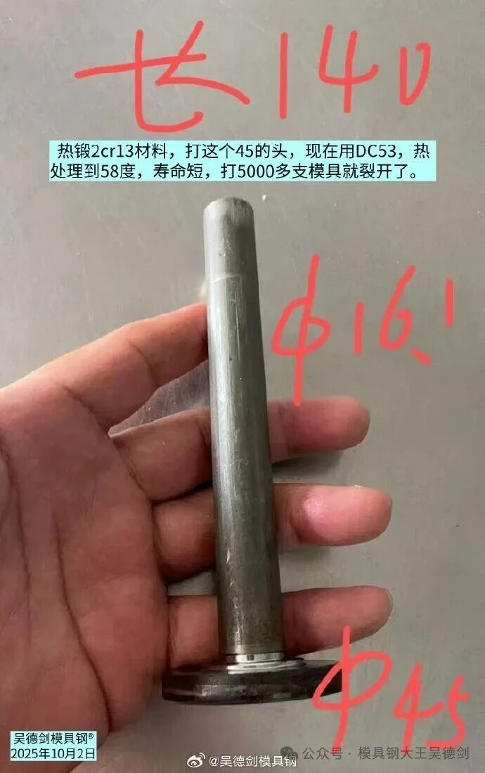 收到網(wǎng)友咨詢(xún)問(wèn):熱鍛2Cr13材料,打這個(gè)45的頭,現(xiàn)在用DC53,熱處理到58度,壽命短,打5000多支模具就裂開(kāi)了。