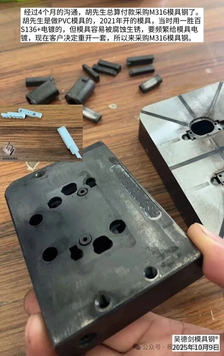 胡先生是做PVC模具的,2021年開的模具,當時用一勝百S136+電鍍的,但模具容易被腐蝕生銹,要頻繁給模具電鍍,現(xiàn)在客戶決定重開一套,所以來采購M316模具鋼。