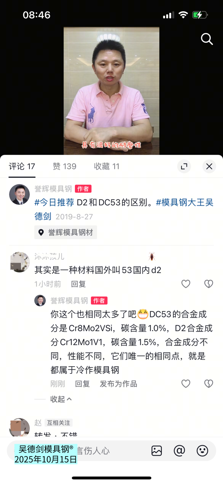 2019年8月27日拍的“ D2和 DC53的區(qū)別”的視頻,有網(wǎng)友評(píng)論說(shuō),其實(shí)是一種材料,國(guó)外叫53,國(guó)內(nèi)d2。