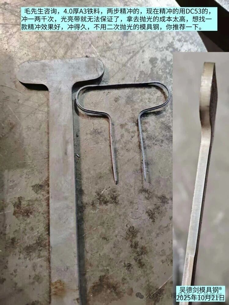 毛先生咨詢,4.0厚A3鐵料,兩步精沖的,先粗沖落料,后精沖光亮帶,但現(xiàn)在精沖的用DC53,沖一兩千次,產(chǎn)品光亮帶就無法保證了,拿去拋光的成本太高,想一款精沖效果好,沖得久,不用二次拋光的模具鋼,你推薦一下。