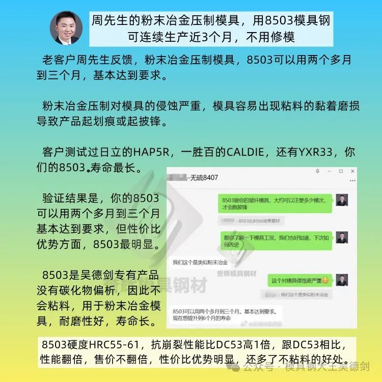 但周先生的粉末冶金模具用8503模具鋼,生產(chǎn)3個月不用修模,對比一勝百的CALDIE,日立的YXR33、HAP5R,8503模具鋼的壽命最長,價格最便宜。