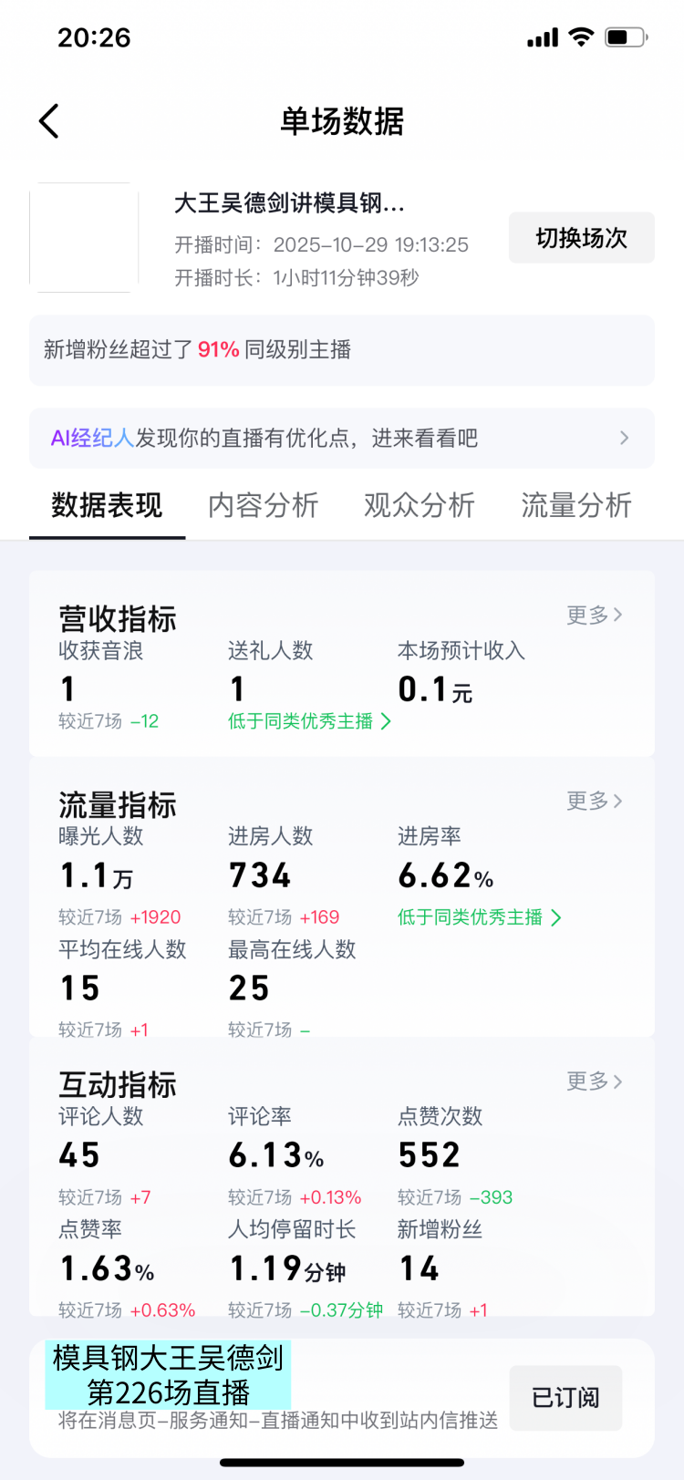 2025年10月29日,我做了1小時(shí)10分鐘的直播,這是我第226場(chǎng)直播。