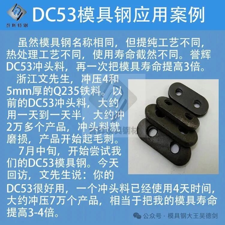 一個(gè)沖頭一般磨4次就要報(bào)廢,譽(yù)輝DC53單次壽命就提高了4倍,相當(dāng)于一個(gè)沖頭抵4個(gè)沖頭用,一個(gè)沖頭的總壽命提高16倍。一個(gè)沖頭抵4個(gè)沖頭用,4個(gè)沖頭的加工費(fèi),已經(jīng)足夠買材料,所以對(duì)于文先生來說,譽(yù)輝DC53是免費(fèi)購買的,一點(diǎn)都不夸張。