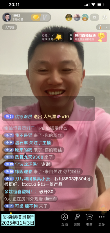 這場直播間的提問比較寬泛,冷沖模的、拉伸模的、塑料模的芯子用料,加玻纖的增強(qiáng)塑料模具用料,熱鍛模的,反正有關(guān)模具的都包含了,這樣看來,模具用料遇到問題的人還很多,直播有的搞。